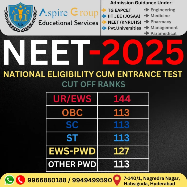 Aspire Group Educational Services(AGES) is best educational consultancy and your one-stop solution for achieving your academic and career goals. We offer personalized educational guidance and expert support for securing seats in Engineering under TG-EAPCET(MPC)[Convenor quota(through TG EAPCET rankings), B. Category (Management), and C. Category (NRI/NRI Sponsorship Quota)],IIT-JEE (Mains & Advance), NEET (Medical & Paramedical) and Pharmacy & Agriculture under TG-EAPCET(BiPC)[Convenor quota(through TG EAPCET rankings), B. Category (Management), and C. Category (NRI/NRI Sponsorship Quota)] &Â Management Studies. Through our experienced team understands your unique needs and provides in-depth college analysis, application assistance, and continuous support to guide you on the path to success. Choose Aspire Group educational services which is best educational consultancy services in Hyderabad and unlock your full potential!